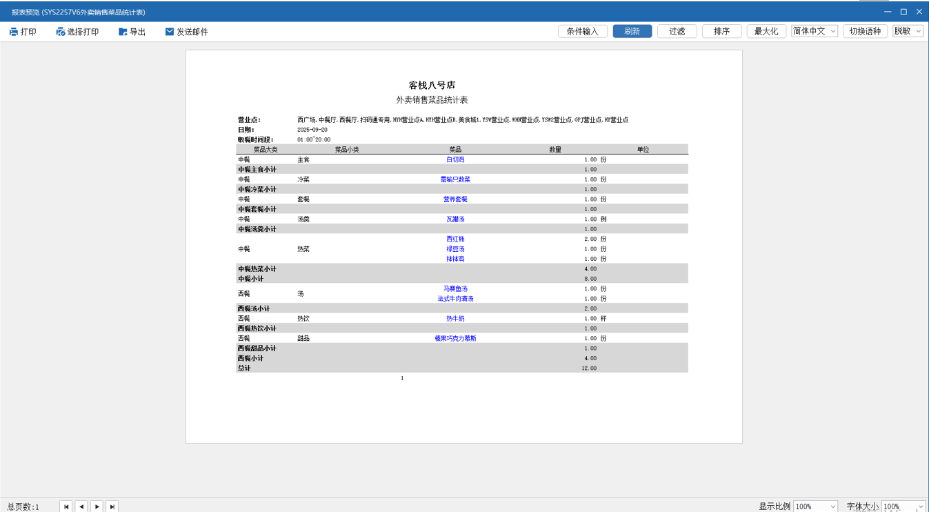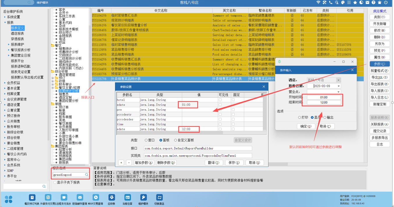 ○ 对接XMS460时,pos订单表将记录取餐时间,且会内置新报表(报表编号:SYS2257V6)统计多天预订的同一天取餐的销售明细