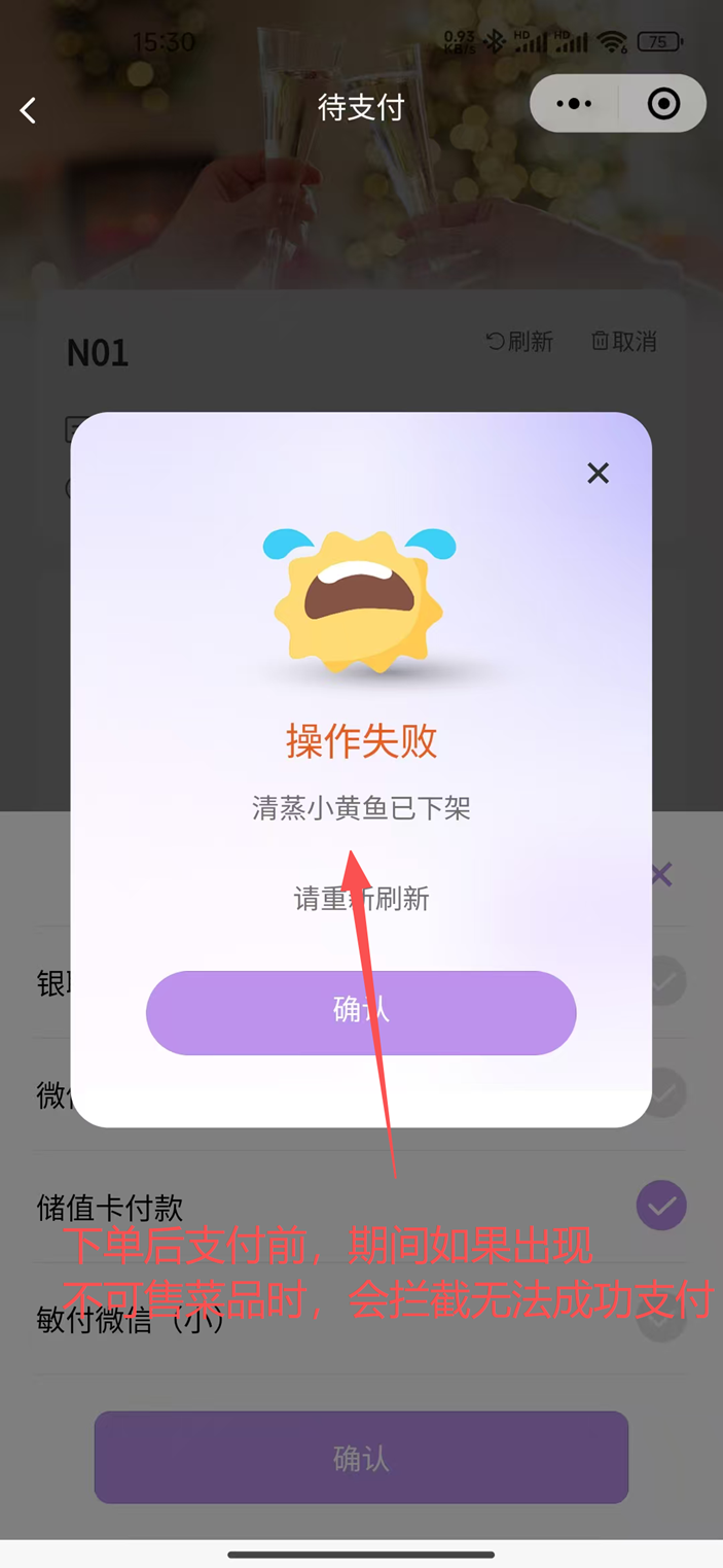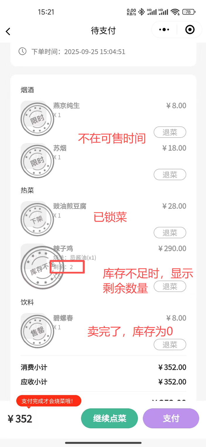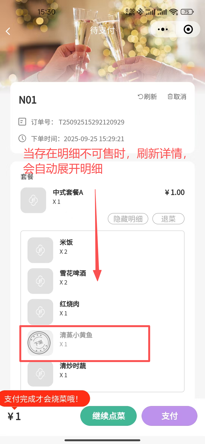 ○ 支付时如存在不可售菜品,客人可手动取消相应菜品,退菜后还可以继续下单其他菜品,然后再次支付即可