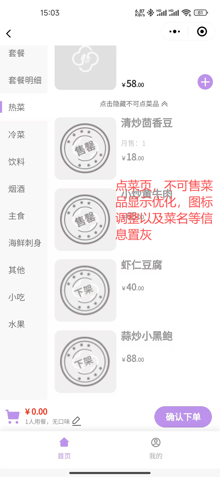 ○ 只有未下单菜品(即临时菜品)才会有标记