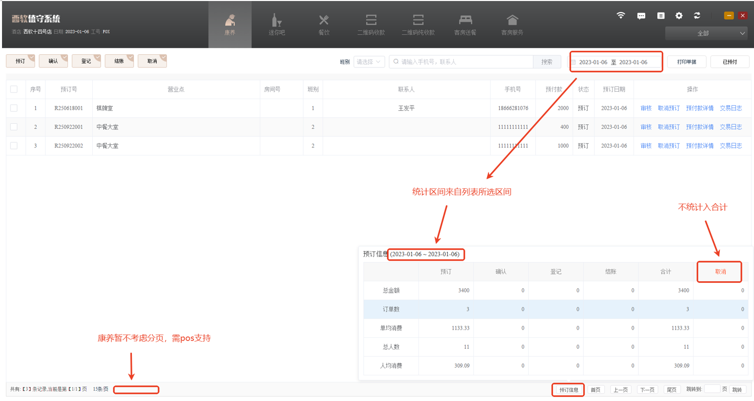 ○ 康养,预订信息,按所选区间统计各状态订单信息:总金额、订单数、单均消费、总人数、人均消费