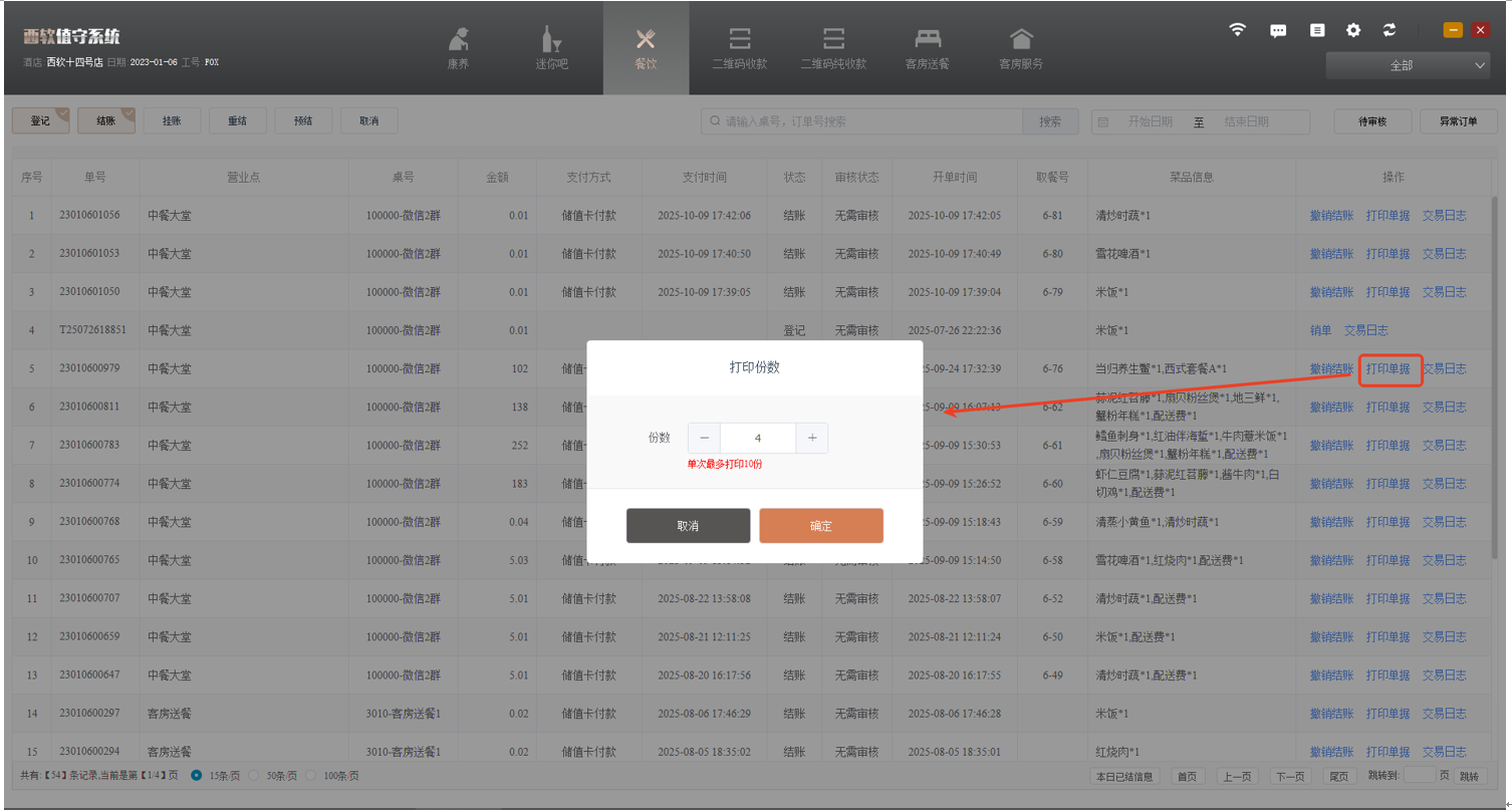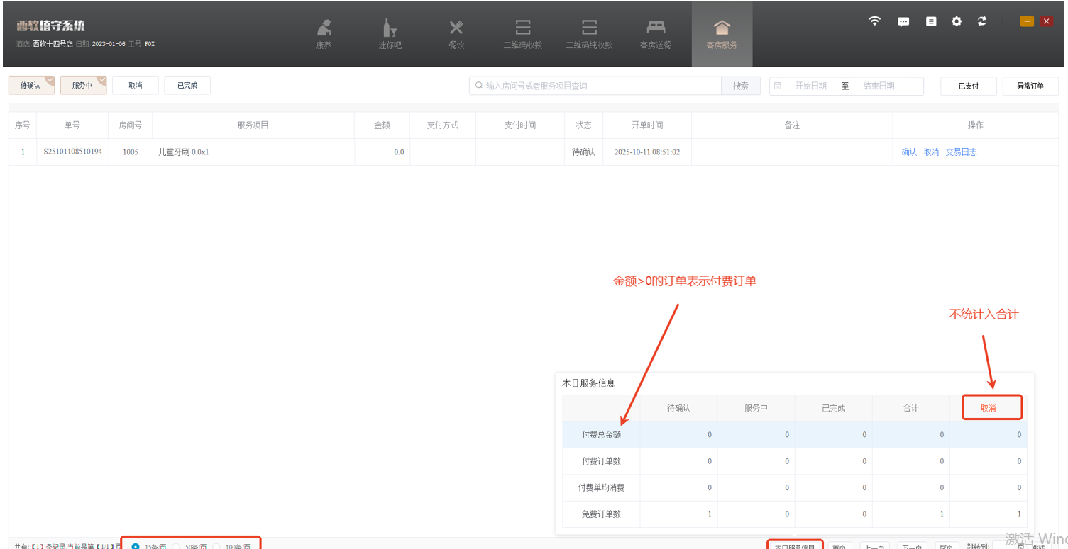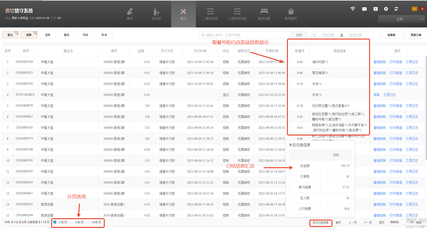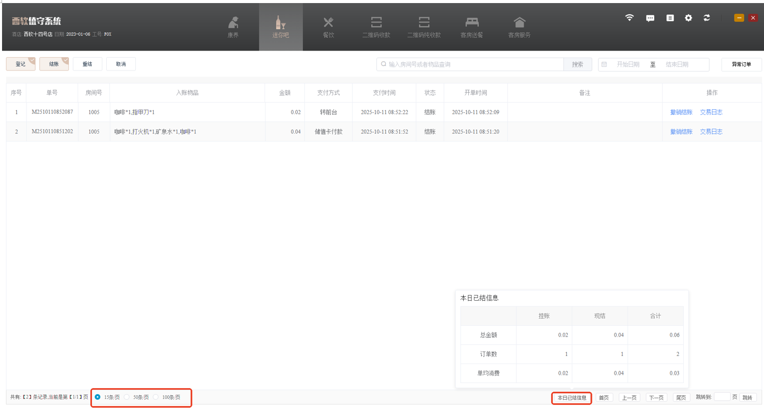 ○ 迷你吧,本日已结信息(挂账、现结):总金额、订单数、单均消费