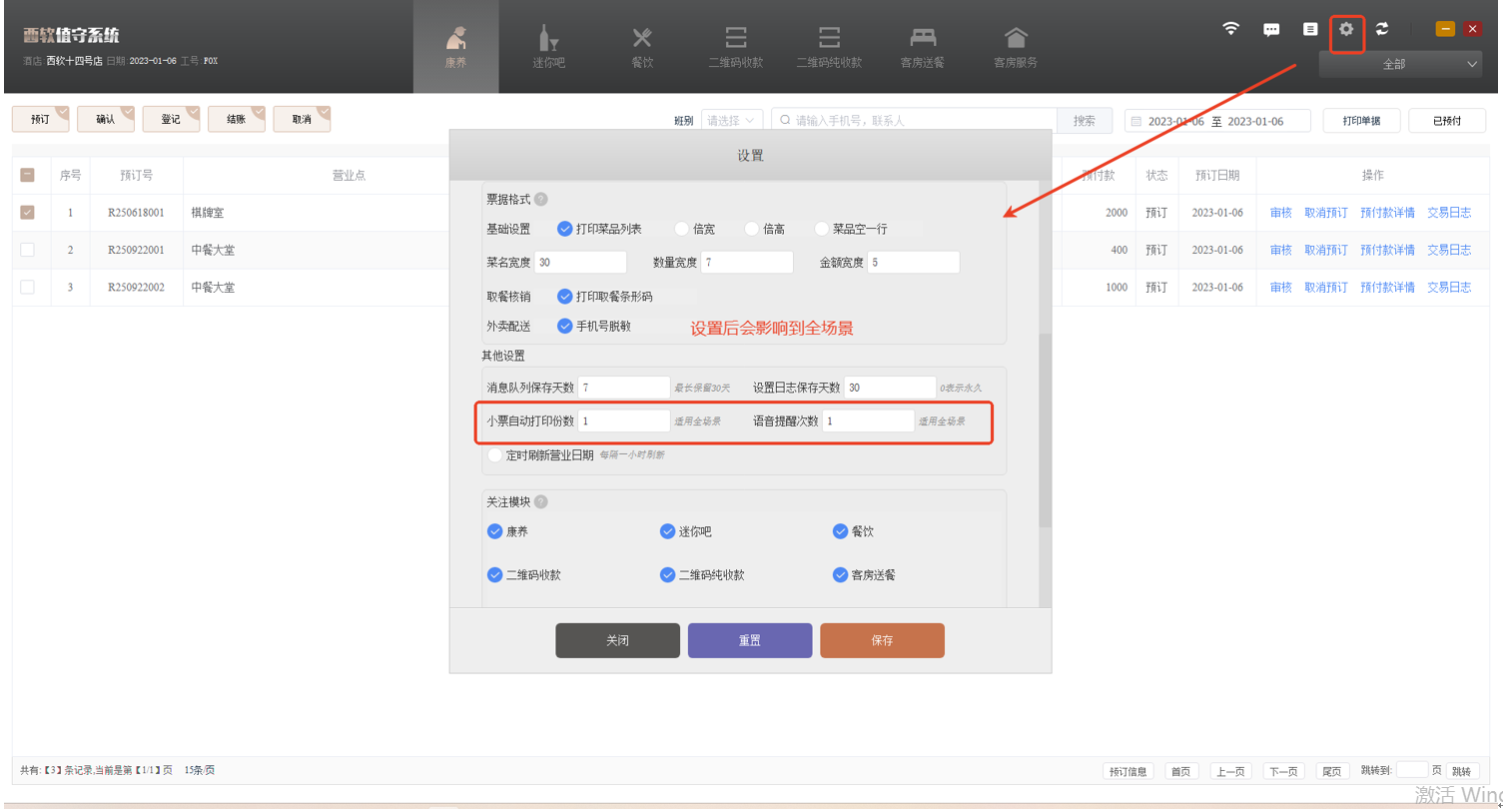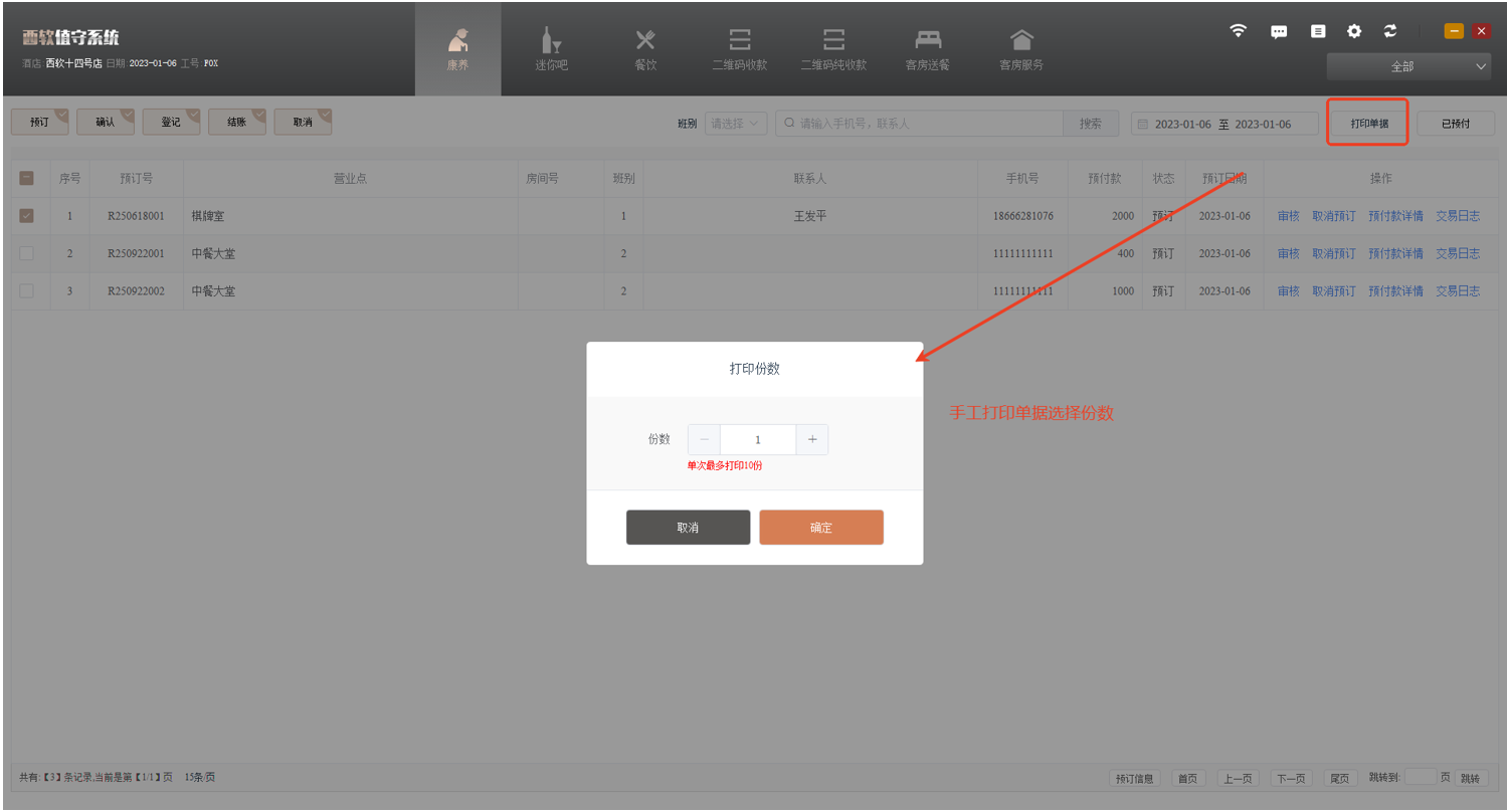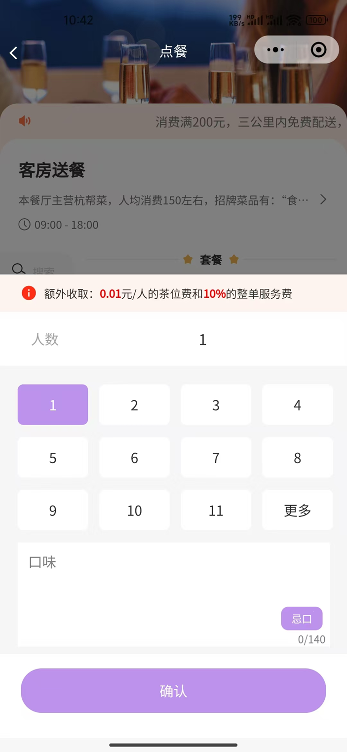 ■ 营业点必选人数开启后,客房送餐进入点餐页会自动弹出人数选择框,且不允许叉掉