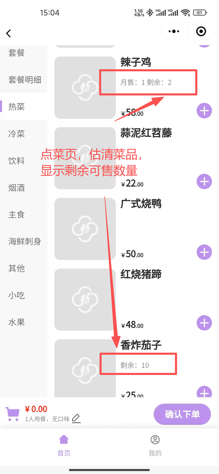 ● 已售罄菜品逻辑:完善各种不可售场景的判断,明确标记相应菜品以及剩余可售数量,优化客户体验的同时尽量解决支付后无法入账的问题