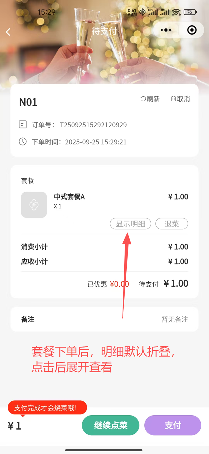 ○ 先付模式或后付审核模式,待支付详情,相应菜品有明确标记